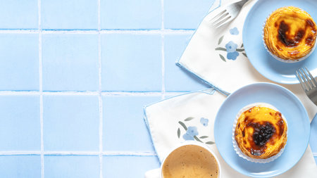 Portuguese dessert Pastel de nata with coffee on blue tile
