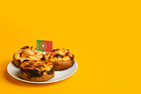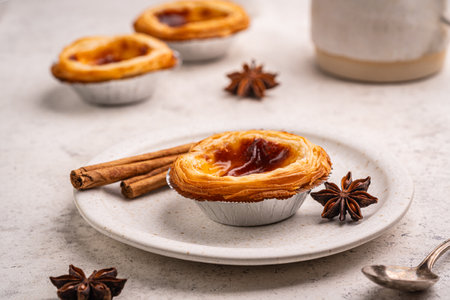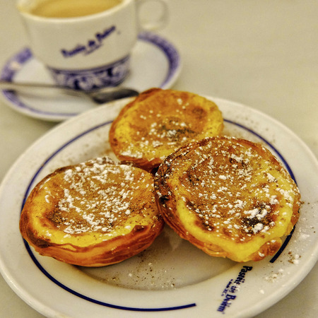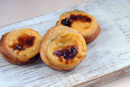 Popular dessert pastel de nata or Portuguese custard egg tarts. These are pastries inspired by an original recipe called Pastéis de Belém, which were created before the 18th century by Catholic monks at the Jerónimos Monastery in Lisbon, Portugal.