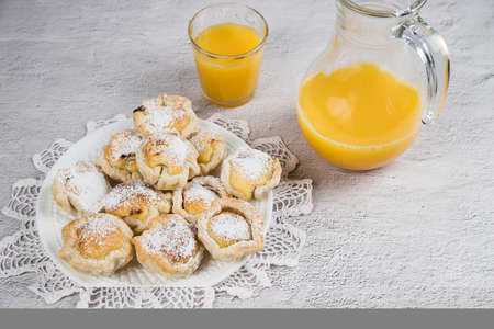 Breakfast with orange juice and traditional Portuguese homemade puff pastry with egg cream.