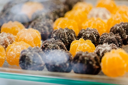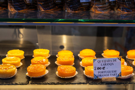 Display of a candy shop with orange queijada in Bolhao Market, street food market in Porto or Oporto, Portugal