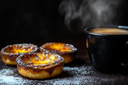 Close-up of traditional Portuguese Pasteis de Nata and coffee.