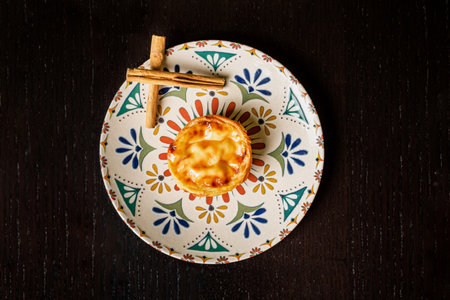 Traditional Portuguese dessert Pastel de nata on blue tile