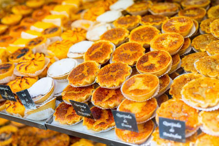 Diffeent types of Portuguese traditional desert - Pasteis de Nata (Pastel de Nata) - freshly cooked and displayed for sale at a street food market, soft focus