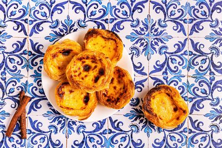 Pastel de nata. Traditional Portuguese dessert, egg tart over Traditional Azulejo tiles and marble background. Top view