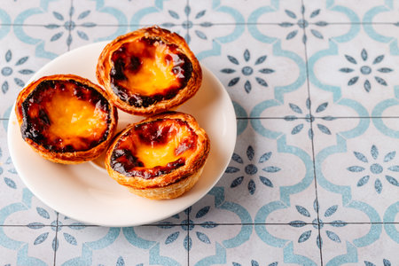Plate of freshly baked egg tart or custard tart (pastel de nata), a famous dessert in Lisbon Portugal. Selective focus