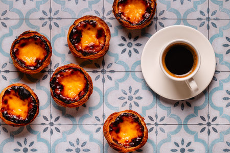 A top view of delicious Portuguese egg tarts with a cup of espresso on a white table