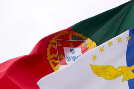 Azores and Portugal Official Flags bouncing in the air on a windy day, São Miguel Island, Azores. Azorean and Portuguese Flag flying on the air.
