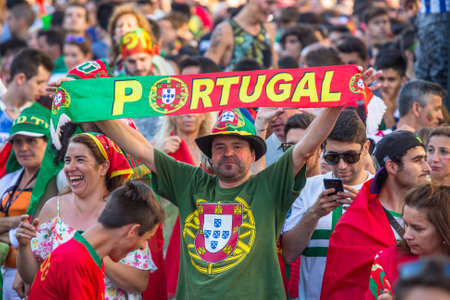 PORTO, PORTUGAL - JUL 10, 2016: Portuguese fans during video translation of the football match Portugal - France final of the European championship 2016, in Liberdade Square at city center of Porto.