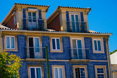 vintage tiled facade at Lisbon with windows, balcony and typical portuguese tiles on the wall, picturesque lisbon architecture