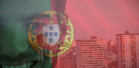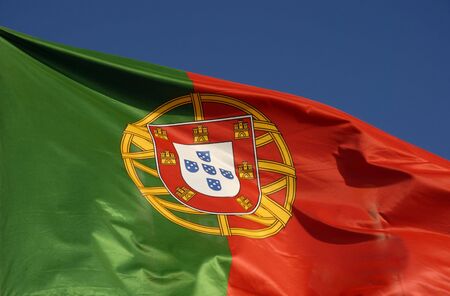 Fluttering Portugal flag on beautiful colorful sunset or sunrise background. Portugal success and happiness concept.