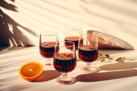 Glasses with cold dry fino and sweet cream sherry fortified wine and orange in summer sunlights, andalusian style interior on background