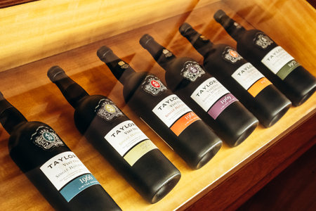 Porto, Portugal - December 28, 2024: Bottles of port wine in Taylor’s Port wine cellars in Porto, Portugal