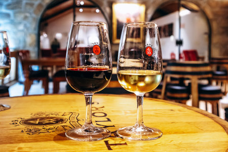 Porto, Portugal - December 28, 2024: Two glasses of Taylor ruby and white port wine in Porto