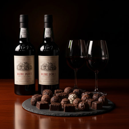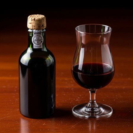 Cinematic shot of a port wine bottle and two empty snifters on a dusty table, illuminated by harsh w