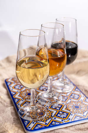 Tasting of Portuguese fortified port wine, produced in Douro Valley, North of Portugal in sunny day