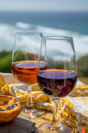 Portugal's traditional food and drink, glass of porto wine and sweet dessert Pastel de nata egg custard tart pastry served with view on blue Atlantic ocean near Sintra in Lisbon area, Portugal