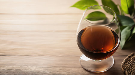 A glass of amber liquid sits on a wooden table, complemented by green leaves and a woven coaster, creating a serene and elegant still life composition.