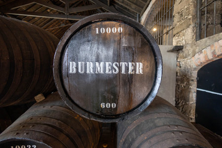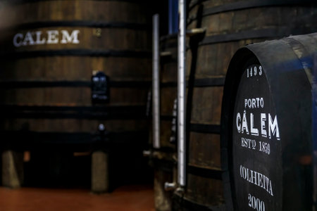Porto, Portugal - May 31, 2018: Stored branded barrels of port wine on display at Calem cellar, popular brand founded in 1859 in Vila Nova de Gaia