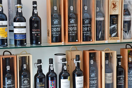 Regua, Portugal - July 10 2022: bottles of Porto wine in the gift shop in the historical Douro museum