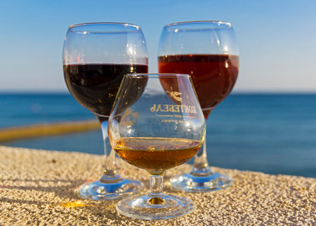 Sudak, Crimea - September 13, 2019: Three glasses with alcoholic drinks on a background of the sea. Crimea.