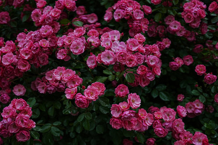 Bush with pink rose flowers on a background of emerald foliage, flowering,