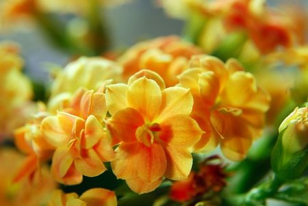 focus on orange flowers helenium on the green background, note shallow depth of field