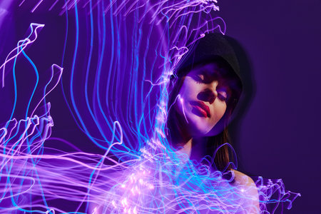 A young woman stands captivated by vibrant light trails in an urban setting at night creating an ethereal atmosphere around her.