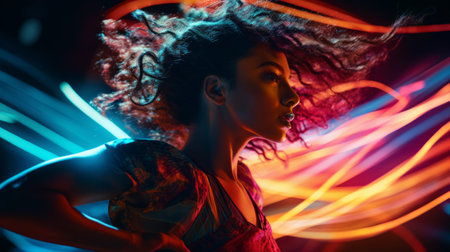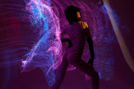 Beautiful fashionable girl disco neon lines luxury fashion color background unaltered