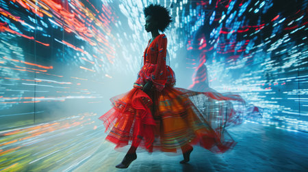 The photo shows a woman in a red dress dancing in front of a colorful background. She is wearing a red dress with a long train and her hair is flowing behind her. The background is made up of colorful lights and the woman appears to be in a state of motion.