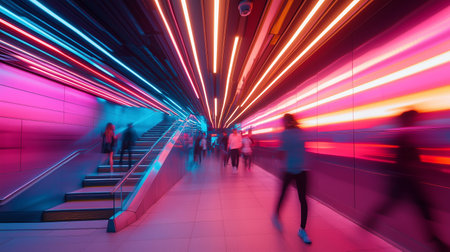 Dynamic urban walkway illuminated by vibrant neon lights highlighting a lively crowd moving at dusk