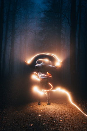 mystique in the autumn forest, where a boy in a blue jacket flies light from his left hand to his right and around his whole body. Mysterious siuleta in the wild surrounded by many lights.