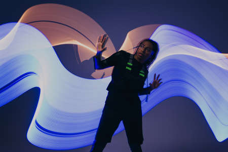 Dancing female standing on tiptoe in colourful neon studio light. Long exposure.