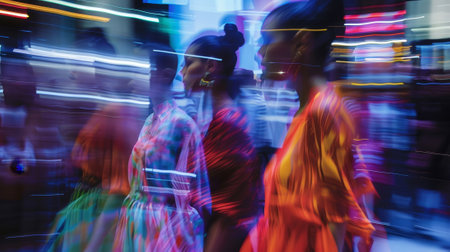A group of women are walking down a street in neon colors. The image is blurry and has a sense of movement and energy