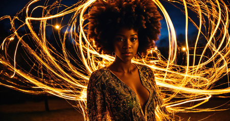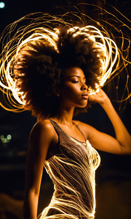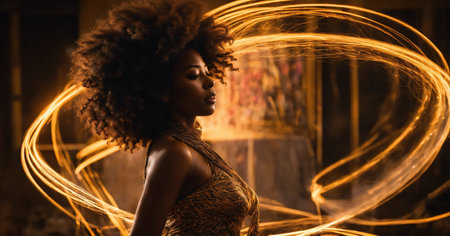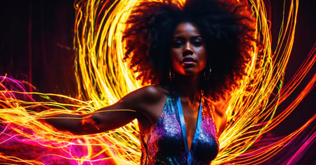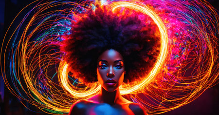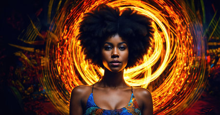 Beautiful african american woman with afro hairstyle and outlined in light. ai generative.