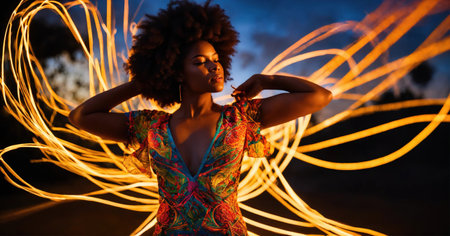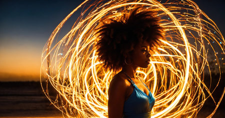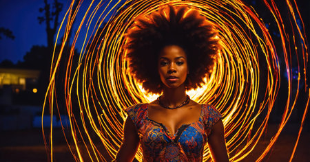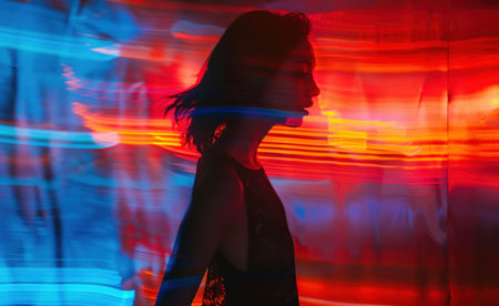 A woman with a tied-back hairstyle stands in profile against a vibrant backdrop of swirling lights. The colors of red and white create a dynamic effect as they spiral around her figure, highlighting her silhouette. The scene evokes a sense of wonder and movement, capturing an enchanting moment during nighttime.