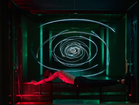 A person gazes curiously amidst swirling neon lights, creating a dynamic urban atmosphere during the night.