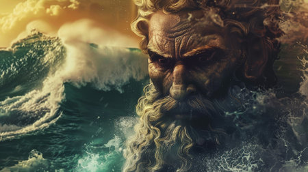 Poseidon, the Greek god of the seas, surrounded by ocean waves