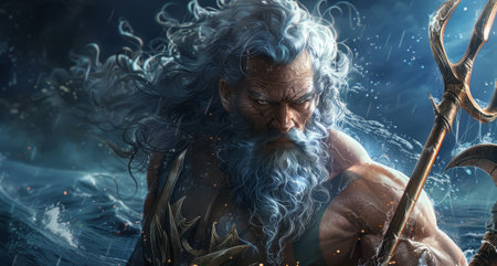 A powerful god of the sea stands amidst crashing waves holding a trident a digital painting showcasing his strength and divinity.