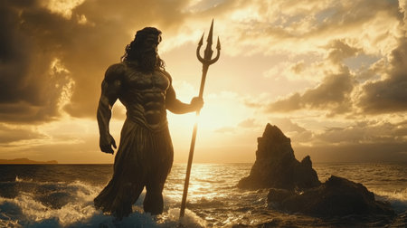 A muscular, long-haired god of the sea emerges from the waves, holding a golden trident.