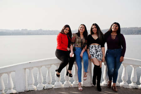 Group of four happy and pretty latino girls from Ecuador posed against lake side.