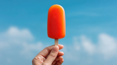 A vibrant orange popsicle held against a stunning blue sky, evoking feelings of summer joy and refreshing delight during hot weather. Perfect for food enthusiasts!