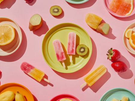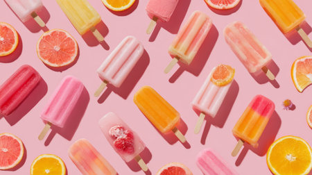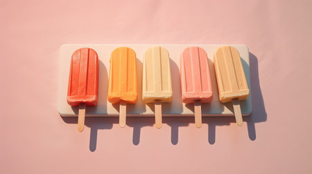 Bright and cheerful popsicles placed randomly on a pink pastel flat lay, capturing summer fun and freshness in a minimal concept