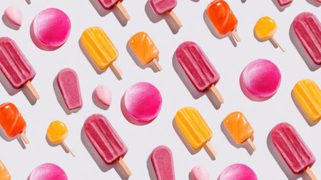 A vibrant and playful arrangement of colorful popsicles, candies, and fruit pieces on a light background, perfect for summer themes.