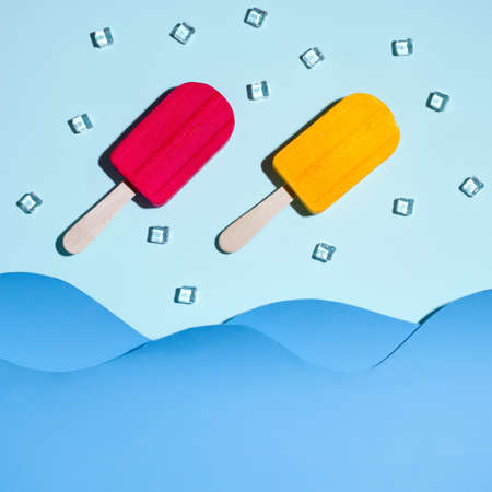 Ice cream popsicle. Fruity popsicle, ice cream with berries, fruits on color pastel background. Frozen fruit berry popsicle. Homemade ice lolly. Summer ice cream minimal fashion idea. Realistic photo