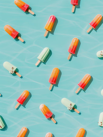 A pattern of colorful popsicles floating on a turquoise pool background, capturing the essence of summer refreshment,