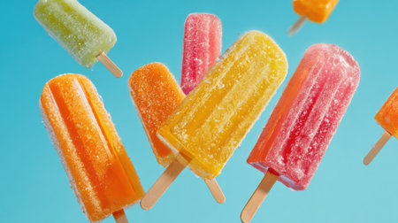 Brightly colored frozen popsicles in various fruity flavors hover against a vivid blue background. The scene captures the essence of summer and emphasizes fun refreshment and variety.