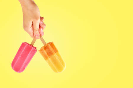 Colorful ice creams in woman hand on yellow background with copy space. Summer background