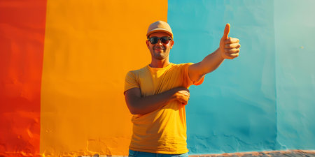 Illustrated gesture of approval against colorful backdrop conveys energy and optimism. Concept Illustration/Typography, Approval Gesture, Colorful Backdrop, Energy, Optimism