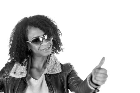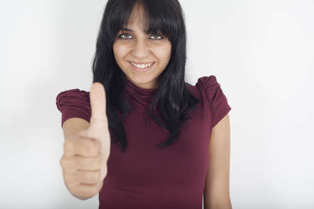 young latin woman smiling and showing thumbs up on a white background in Latin America