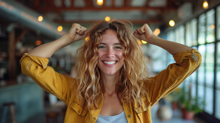 In the image, a joyful woman is confidently raising her fist in the air, displaying happiness and selfassurance